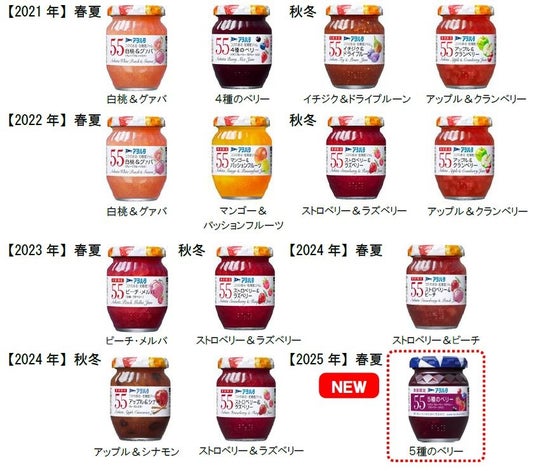 アヲハタ株式会社(本社:広島県竹原市、代表取締役社長:山本範雄、以下アヲハタ)は、2025年に発売から55周年を迎える低糖度ジャム「アヲハタ 55」シリーズから、春夏の季節限定品として「5種のベリー」を新たに発売し、2月20日(木)から全国に出荷します。