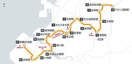 (那覇空港・赤嶺・小禄・奥武山公園・壺川・旭橋・県庁前・美栄橋・牧志・安里・おもろまち・古島・市立病院前・儀保・首里・石嶺・経塚・浦添前田・てだこ浦西)
