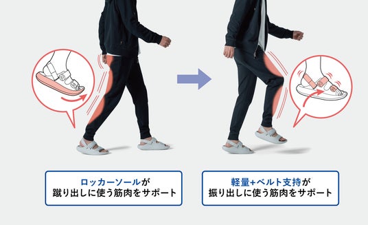 歩行を楽に、歩きやすくロッカーソールが、つま先を自然に持ち上がるようにサポートするので楽に歩けます。さらに軽量設計(片足150g※)に加え、甲ベルトとバックストラップで足にしっかりフィットさせるため、脚に負担がかかりにくく軽やかに歩けます。