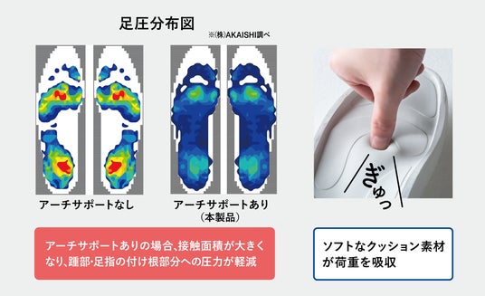 足裏をやさしくサポート酷使した足裏を、足裏の凹凸カーブにぴったりとフィットするフットベッド形状と、足裏にかかる体重を吸収して分散する柔らかクッションで休息させます。