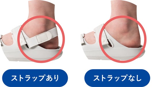 ストラップは取り外し可能、用途に合わせて使い分けしっかり歩く・車や自転車に乗る時はストラップありに、頻繁に脱ぎ履きする時はストラップなしで使い分け。