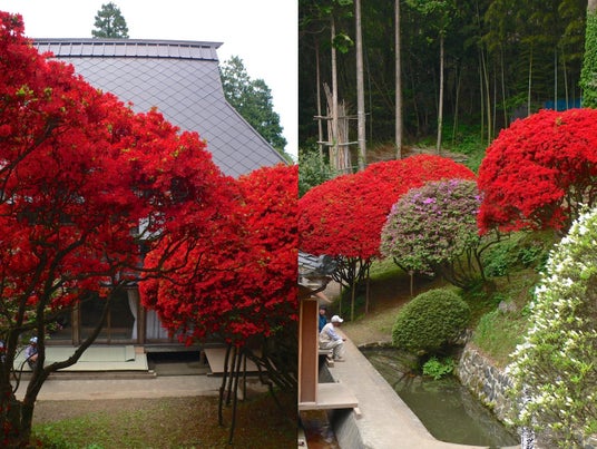 (左)「本霧島」 花は小輪一重で鮮やかな濃い朱赤色。江戸時代に、九州薩摩の霧島山から江戸に渡り、他に類を見ない真紅の花が評判となり、17世紀後半のツツジブームのきっかけを作った。