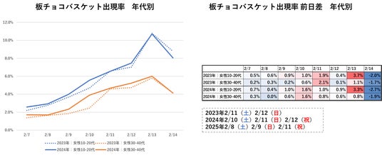 また、出現率の前日差をみると、2023年は2/11(土)、2024年は2/10(土)の出現率の前日差が大きく、バレンタイン直前の週末の土曜日に出現率の上昇幅が大きくなることがわかります。これらの傾向から、2025年は2/8(土)の板チョコの購買がアップするのではないでしょうか。