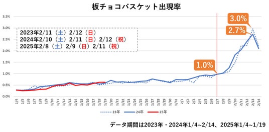 2023年・2024年・2025年における板チョコレート(*2)のバスケット出現率(レジ通過バスケットのうち板チョコが入ったバスケットの割合)を分析すると、バレンタインデーの1週間前となる2/7から出現率1.0%を超え、2/11に急激に伸びていることがわかります。2023年と2024年は、曜日が異なっていても同じ波形を描いていることから、今年も傾向は変わらず1週間前から前日の2/13がピークになることが予測されます。