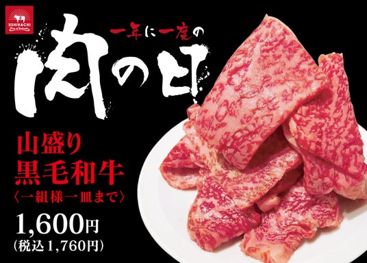 毎年恒例の「肉の日」を記念し、USHIHACHIでは、黒毛和牛の贅沢な味わいを存分に楽しめる特別メニューをご用意しました。通常、「黒毛和牛 特上カルビ(100g)」を1,890円(税込)でご提供しておりますが、今回の「肉の日」では、さらにランクの高いA5黒毛和牛を、通常の半額以下となる 『200g 1,760円(税込)』でご提供! これまでにない破格の価格設定を実現しました。