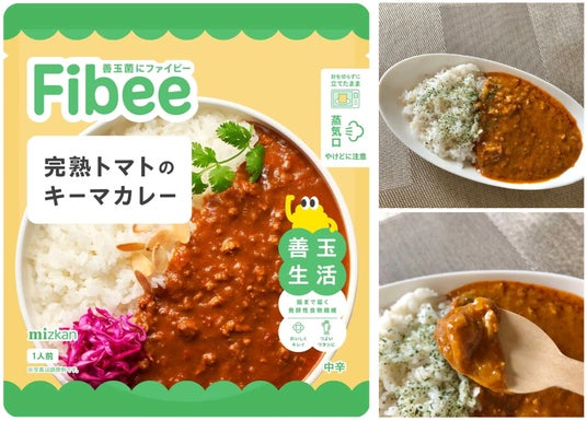発酵性食物繊維を含むFibeeのキーマカレー。完熟トマトの濃厚な風味と12種のスパイスが調和し、味わいを引き立てる本格的な一品です。美味しく食事を楽しみながら発酵性食物繊維を摂れます。