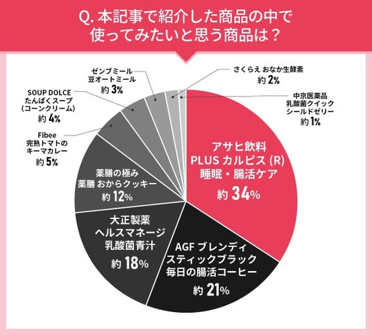 取り入れてみたい商品に関しては、習慣化しやすい飲み物が人気。おやつや主食なども含め、もともと好んで飲んでいるものの置き換えが、腸活しやすいと感じるようです。配合されている成分以外にも、続けやすさは大切なポイントですね。