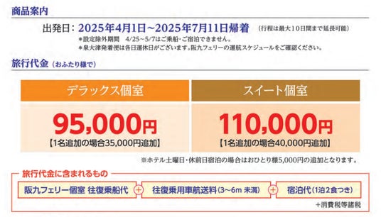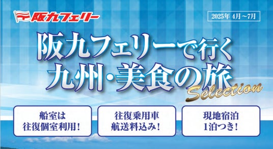 2025年4月~7月のご出発で、阪九フェリー、大阪・泉大津港もしくは兵庫・神戸六甲アイランド港から出港し、別府や湯布院などの温泉地で豪華なお食事をお楽しみいただける「阪九フェリーで行く九