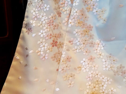 特徴:淡い水色とクリームのぼかし染めが優雅な印象を演出し、手触りの良い上質な正絹が魅力。桜の刺繍が美しく映え、フォーマルな場やお花見にぴったり。