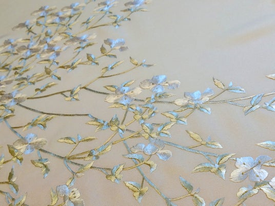 特徴:金糸を使用し、華やかさをプラス。上品な色合いと手刺繍の繊細な美しさが際立ち、フォーマルシーンや特別な日の装いに最適。