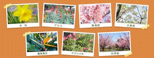 水仙(12~3月)・アロエ(11~2月)・熱海桜(1月中旬~2月末)・河津桜(1月中旬~2月末)・極楽鳥花(1~6月中旬)・ヤブツバキ(1月中旬~3月中旬)・大島桜(3月中旬~4月末)