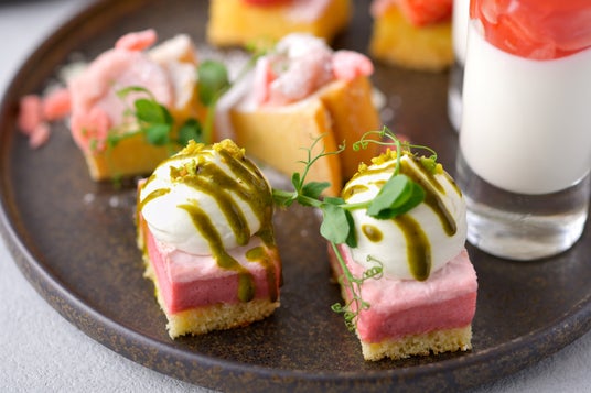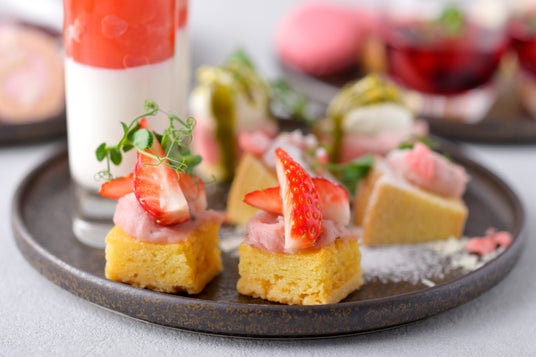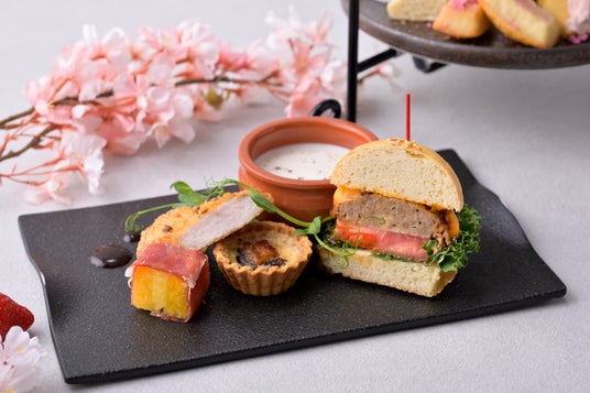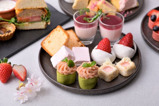 春らしい優しい色合いに包まれたスイーツとセイボリーが並びます。旬のいちごと桜をふんだんに使用したアフタヌーンティーでお花見気分をお楽しみください。