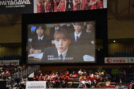 山川さんは、三遠ネオフェニックス対ファイティングイーグルス名古屋戦ハーフタイム中の午後8時すぎに、肝臓の正しい知識を広める活動をしているマスコットキャラクター「肝美ちゃん」と共に登場。「知って、肝炎プロジェクト」の啓発動画放映後、会場に詰めかけた3300人を超えるブースター(ファン)に向けて、健康に対する思いを伝えました。