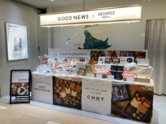 今回の出店は、新千歳空港で「バターのいとこ」を展開する株式会社GOODNEWS(代表取締役:宮本吾一)の取り組み「GOOD NEWS NEIGHBORS」の一環である"北海道を応援し、北海道に還元したい"、"北海道に根差した商品を応援したい"といった想いから生まれたGOOD NEWS HOKKAIDOの企画として実現しました。バターの製造過程で廃棄されがちな原料を有効活用するなど、フードロス削減を意識した製品開発を行っている「バターのいとこ」のお隣で、CHaT VEGAN AND GLUTENFREEと1ヶ月間の出店を通じ、