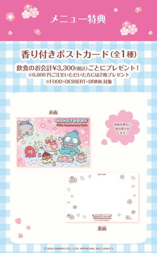 ■メニュー注文特典:カフェをご利用いただき、メニューを税込3,300円ご注文毎に「香り付きポストカード(さくらの香り)」を1枚プレゼント。