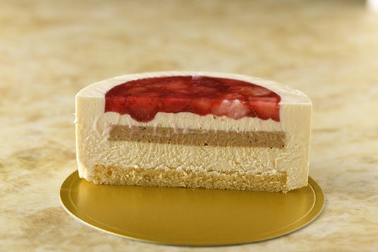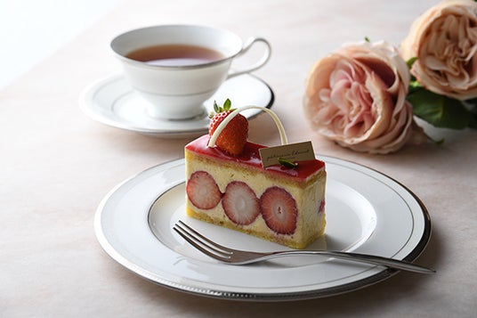 なめらかな紅茶のクレームブリュレをマスカルポーネムースの中に詰め、表面にいちごのジュレをのぞかせたケーキ。