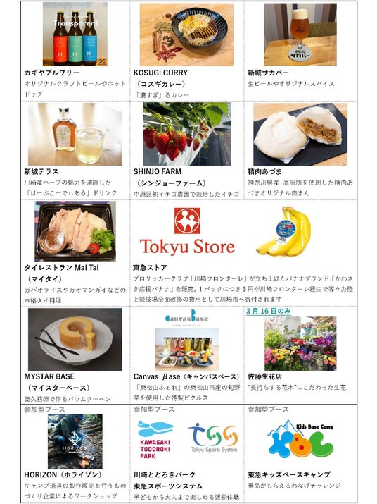 本イベントは、まちの玄関口として武蔵小杉周辺地域の核(コア)に位置し、東急東横線・目黒線武蔵小杉駅南口に隣接する都市公園「こすぎコアパーク」を主会場として、当施設と連携して開催します。川崎市中原区で初めてイチゴ農園を開園した農家や、地域活性を推進する創業50年のものづくり企業など、地域の事業者を中心に11店舗が出店。芝生やテントを設置した会場では、武蔵小杉のまちの魅力をつくり出している、地元で人気のカレーやクラフトビール、スイーツを味わえます。キャラクター撮影会やワークショップ、わなげイベントなども開催し、子どもから大人まで、自然と都会の融合する武蔵小杉エリアの魅力をグランピング気分で満喫できるイベントです。