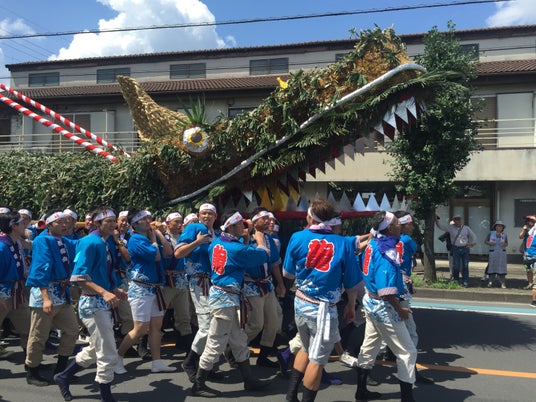 写真:『脚折雨乞行事』4年に一度、鶴ヶ島市脚折でおこなわれる雨乞行事では、巨大な龍蛇が製作される。本体には麦藁が使用される。
