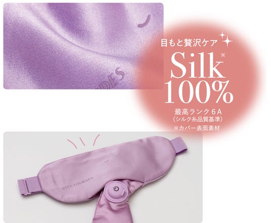 POINT3:シルク100%素材肌に直接着けるため、カバー素材には着け心地の良いシルク100%素材※(最高ランク6A)を採用。目もとの贅沢ケアとも言える気持ちよさです。また、カバーは取り外して洗えるので、いつも清潔に保つことができます。
