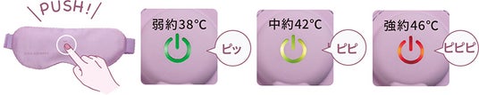 目もとから広がる温かさは3段階。弱約38℃、中約42℃、強約46℃から選べます。設定時に音でお知らせし、本製品を装着したままで調整できます。