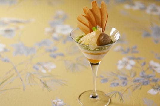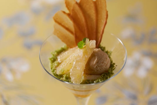 3・4月は、高知県の特産品である土佐文旦と、ヨーグルトやオレンジクリームを使用した春らしく爽やかな『土佐文旦の大人パフェ』をご用意します。上品な甘さとさっぱりとした酸味が特徴の土佐文旦をベースに、日本酒を使用した文旦リキュールを閉じ込めたコンフィチュールがアクセントとなり、芳醇な香りとともに深みを演出します。パフェのトップには文旦の果肉やバニラアイス、カリッとした芋天風味のチュイールを添え、最後まで飽きることなくお楽しみいただける満足感のある一品です。