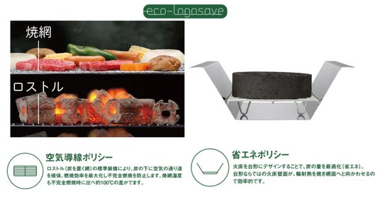 美味しく安全にBBQを楽しんでいただけるよう「エコロゴセーブ機能」を搭載。炭を置く網であるロストルを標準装備し、炭の下に空気の通り道を確保することで空気の循環が促進され、燃焼効率が向上し、不完全燃焼を防止。台形デザインの火床により、炭の量が最適化されて省エネ効果も。