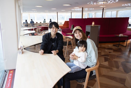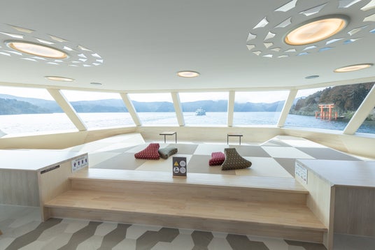 「湖に浮かぶ緑の公園」をコンセプトとし2024年2月23日(金・祝)の「富士山の日」に登場いたしました。船内には、靴を脱いで大きな窓越しに操舵室を見ることができるキッズスペースやその周りを囲むカウンター席、畳の小上がり、ゆりかごチェアなどユニークな席が揃います。屋外デッキには天然芝の広場や、ブランコ型ベンチ、「ケンケンパ」ができる玉砂利デザインの石畳があるなど、歩き回りたくなる回遊性の高い船内です。