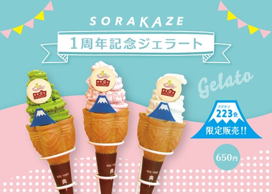 船内1階にあるショップでは、オリジナル飲食メニューとお土産を取り揃えます。「2月23日富士山の日」にかけて223食限定でSORAKAZE1周年記念クッキーを乗せたジェラートを販売します。バニラ・抹茶・豆腐・チョコレート・ストロベリーの5種類のフレーバーです。