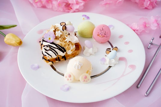 イースターの世界観を表現したクロッフルをメインに、ふんだんに散りばめられたカラフルなイースターエッグやアイスに思わず心が躍る一皿。キュートなうさぎのアイスなど可愛らしいスイーツ達が並びます。オリジナルのジュレマカロンもトッピングされた見た目にも可愛らしいスペシャルなプレートをこころゆくまでお楽しみください。