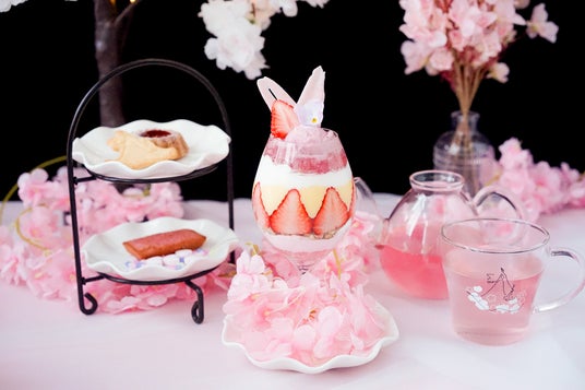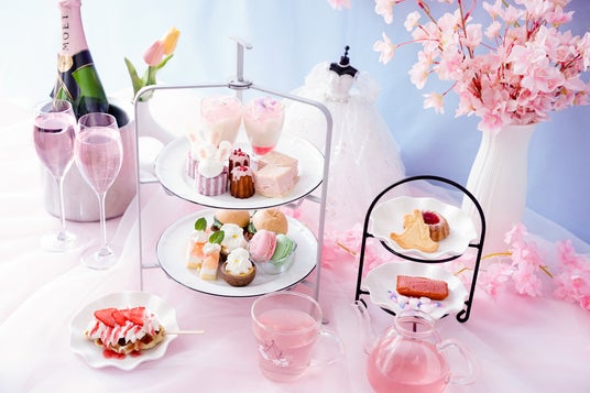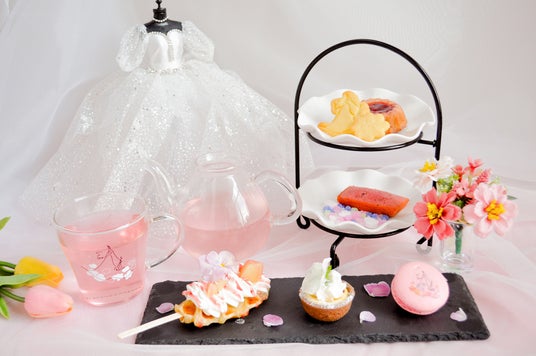 華やかなドレスを中心とした装飾を間近に感じられる店内で、優雅なひとときをお過ごしいただける『お花のアフタヌーンティーセット ~桜とイースターのオーロラプリンセス~』をご用意。うさぎのロールケーキをはじめ、可愛らしいサクラカヌレ、中のジャムが隠し味のオリジナルジュレマカロンなど、