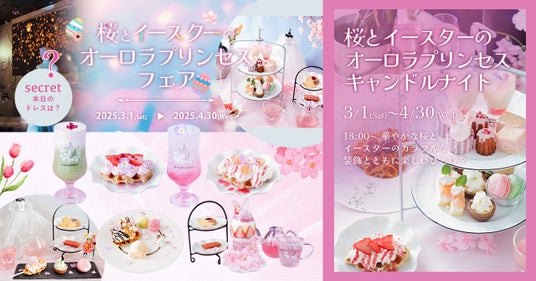 「PLACOLE&DRESSY」プロデュースカフェ DRESSY CAFEで、桜とイースターのオーロラプリンセスフェアを開催。看板メニューのお花のアフタヌーンティーは桜風味の見た目も味も堪能できるスイーツをはじめ、サクラ杏仁パフェ、中のジャムが隠し味のオリジナルジュレマカロンを使用したロマンティックなスイーツが新たに登場。推し活に大人気のプチアフタヌーンティーにはカラフルで可愛らしいフラワークロッフルが登場予定。名古屋店では毎日夜限定イベントとして、桜とイースターのオーロラプリンセスキャンドルナイトを開催。ナイトだけの幻想的な空間で大切な人と素敵な時間をお楽しみください。