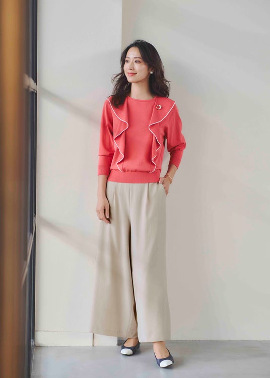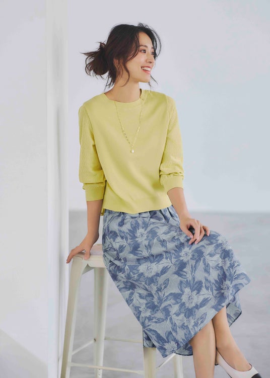 2月14日(金)よりWEBサイトにて公開する春の新作コレクションでは、軽やかなイエローのニットとフラワー柄のスカートスタイル、エレガントでモダンな雰囲気のピンクのフリルニットのパンツスタイルなど、春風を感じさせるカラーパレットが魅力的な新作をご提案します。
