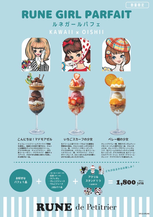 「RUNEガールパフェ」は、内藤ルネの世界観を忠実に再現した、可愛らしく華やかなスイーツです。レトロな少女たちの魅力を詰め込んだ、まるでアートのようなパフェとともに、特別なひとときをお楽しみください。それぞれのキャラクターをイメージしたユニークなフレーバーをご堪能いただけます。