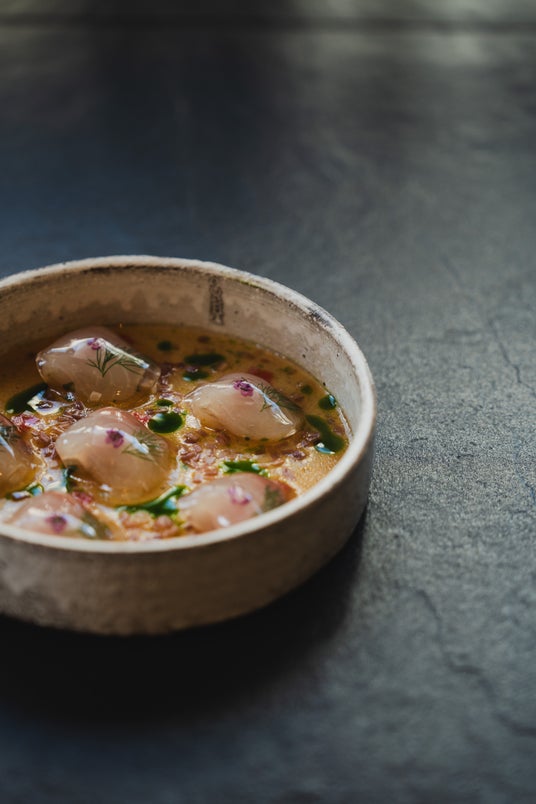 透明なヴェールをまとった鯛の刺身には、生姜のジュレがふんわりと覆い、爽やかな風味を添えます。茗荷のピクルスが彩りと味わいのアクセントとなり、出汁と酢を合わせた香り高い土佐酢のソースが全体を引き立てています。