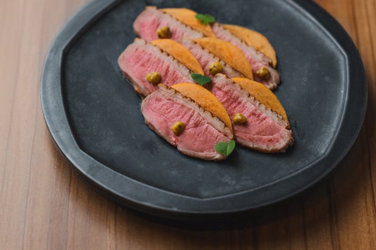 藁焼きした鰹に、香り高いマッシュルームソイソースを添え、色鮮やかな赤芯大根のピクルスを花のように盛り付けた華やかな一皿です。