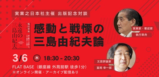 実業之日本社(本社:東京都港区 代表取締役社長:岩野裕一)は、2025年に生誕100周年を迎える三島由紀夫の思想と遺した言葉に迫る特別対談イベント「『永遠の三島由紀夫』出版記念対談イベント ~感動と戦慄の三島由紀夫論~」を開催いたします。