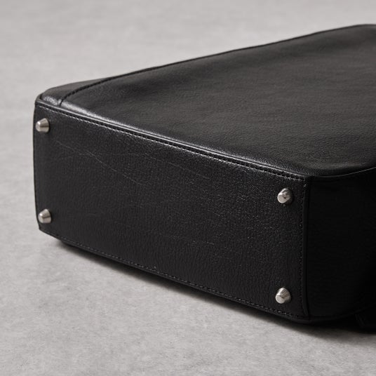 やや丸みを帯びたスクエアフォルムをスリムにまとめ、底鋲をあしらうことでフォーマルな印象のビジネスバックに仕上げています。