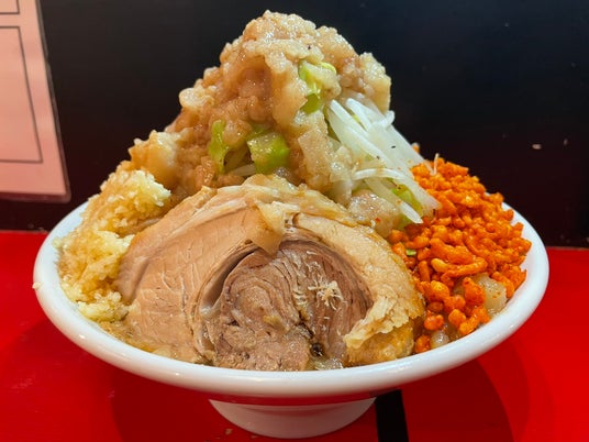深いコクと力強い旨味が響く自信作。じっくり炊き上げたパンチの効いた特性スープとワシワシ感の自家製麺が絡み合い、食べ応え抜群。フワトロの豚、山盛りヤサイ、刺激的な唐揚げがまるで富士山のよう。