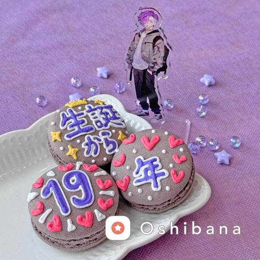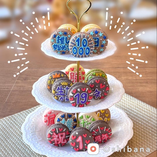 「推しマカロン」は、推し活アプリ 「オシバナ」 が提案する、推しをお祝いするための特別なマカロンです。マカロンと、推し色(推しカラー)、推しマークを組み合わせた造語です。