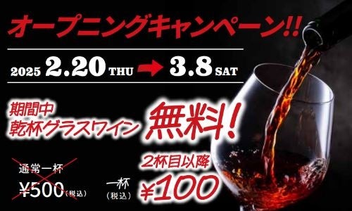2月20日(木)~3月8日(土)の期間中、オープニングキャンペーンを実施いたします。期間中は乾杯グラスワインを無料でご提供し、2杯目以降は1杯100円でお楽しみいただけます。
