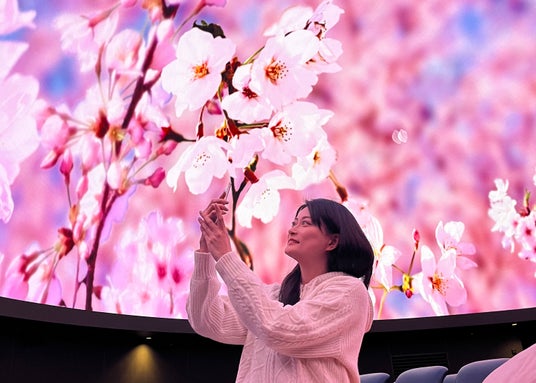 コニカミノルタプラネタリウム天空では、本編上映前の待ち時間にプラネタリウムで満開の桜が見られる、ウェルカム映像を上映。見渡す限りの桜に包まれるプラネタリウムドームで快適にお花見気分が楽しめます。