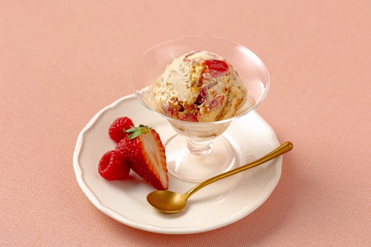 添加物不使用のデンマーク産クリームチーズを使った、コクのあるチーズアイスに、旬を迎えた福岡県産の大粒「あまおう」を贅沢に使った手作りジャム。爽やかな風味の国産レモンがアクセントになっています。