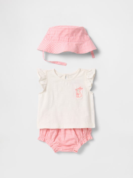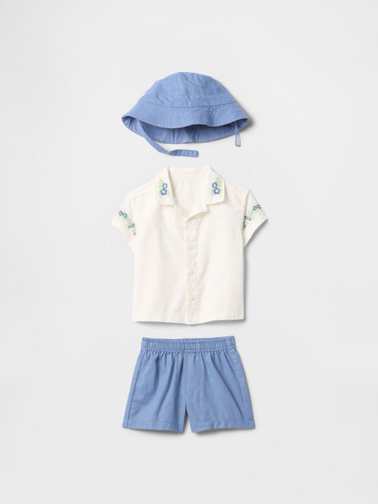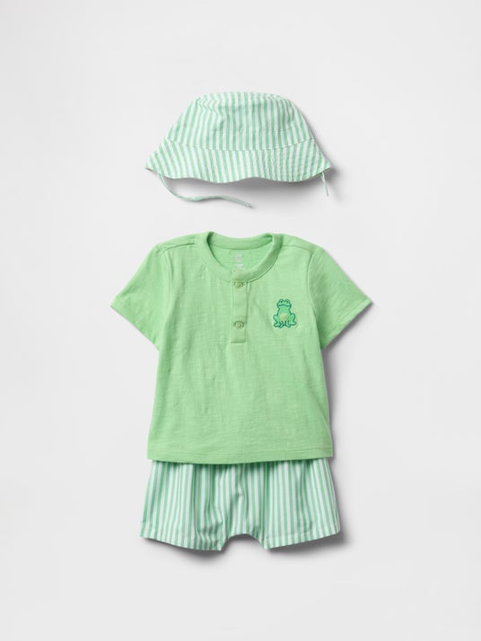 ベビーは、Gapならではのアパレルと小物のセットアイテムがバリエーション豊かに登場。シブリングアイテムとしても楽しめるトドラーガールズと同デザインの花柄アイレットレーストップス×ショーツのコットンリネン ラッフルフリル コーデセットや、エンブロイダリー開襟シャツ×ショーツ×ハットのコットンリネン 刺繍 コーデセットなどがラインナップ。新生児向けにはうさぎやアヒル、カエルなどアニマル柄の刺繍とストライプやチェック柄の組み合わせがキュートなTシャツ×ショーツ×帽子のベビー服 3点コーデセットが必見で、ベビーへのギフトにも最適です。