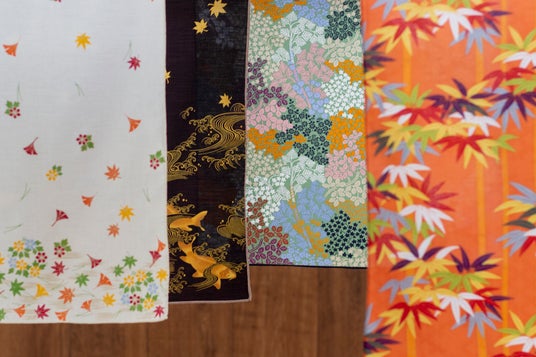 兵庫県を拠点とする演能団体夙川能舞台「瓦照苑(がしょうえん)」の貴重な能装束(のうしょうぞく)をもとにデザインしたハンカチーフ。能装束の繊細な柄と鮮やかな発色を表現するため、手捺染で一枚一枚丁寧に仕上げました。様々な文様が織りなす日本の伝統美と、熟練の職人の技術が融合した「新たな芸術」に、どうぞ触れてみてください。
