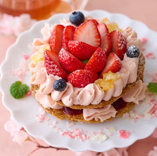 桜香る優しい甘さの練乳ミルクのバタークリーム、宇治抹茶アイス、桜風味のラズベリーソースをサクサクのパイでサンドし、苺、ブルーベリー、抹茶ホイップをトッピング。