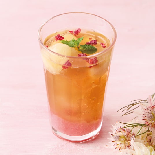 はちみつ入りピーチピューレに、ピーチアールグレイのアイスティー、ライチとジャスミンが華やかに香るジュレを重ねたフルーツエードティー。