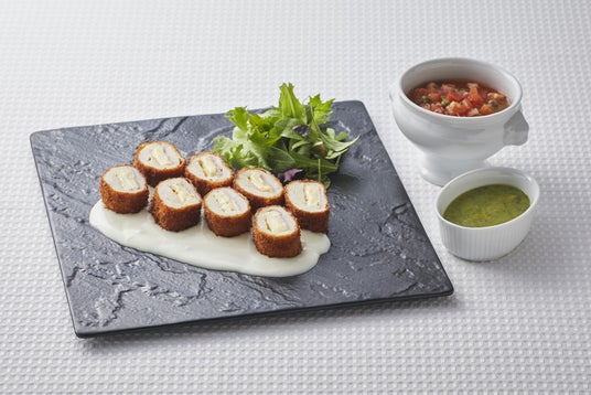 ジューシーな鶏むね肉に濃厚なチーズとハムを包み込み、外はカリッと香ばしく仕上げました。さわやかな酸味のグリーンマスタードソースがアクセントになった贅沢な一品です。