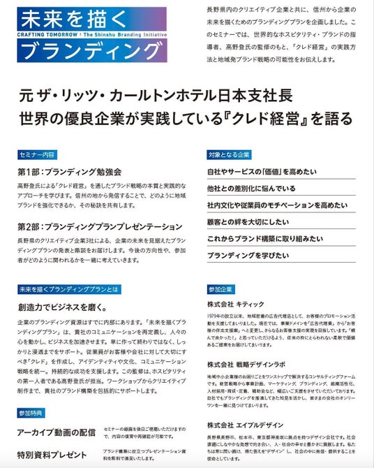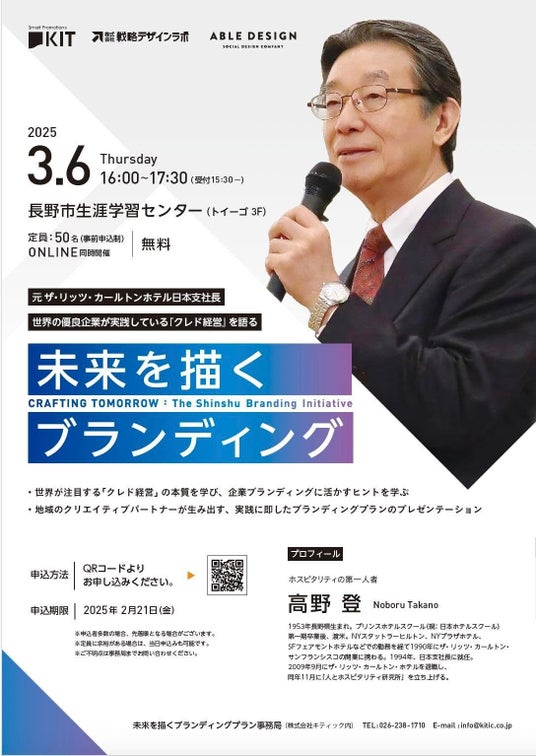 地域の総合広告代理店である株式会社キティック(所在地:長野市県町484-1 センターBOA303、代表:中澤洋一)は、元ザ・リッツ・カールトン日本支社長 高野登氏をお招きし、「未来を描くブランディング」セミナーを開催いたします。なお、本セミナーは同じく長野市の事業者である株式会社エイブルデザイン、株式会社戦略デザインラボとの3社共催によるセミナーとなります。