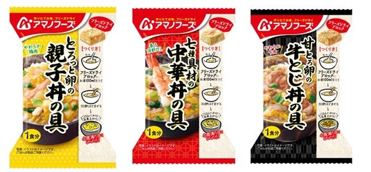 アサヒグループ食品株式会社(本社 東京、社長 川原浩)は、「アマノフーズ」ブランドのフリーズドライのお食事シリーズのお惣菜3アイテムを『とろっと卵の親子丼の具』『七種具材の中華丼の具』『甘とろ卵の牛とじ丼の具』として3月3日からパッケージをリニューアルして発売します。あわせて、3アイテムを詰め合わせた『丼の具3種セット4食』を同日から発売します。中味の変更はありません。