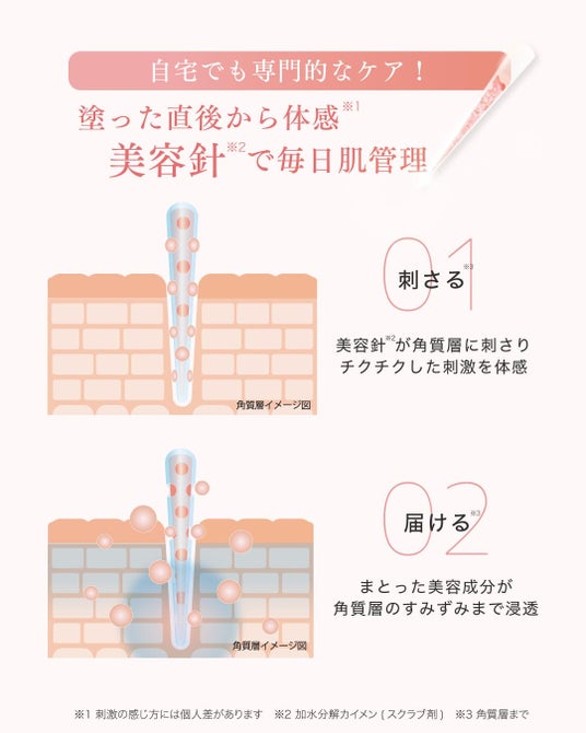 約5万本※9の美容針※2が美容成分をまとった状態で肌に刺さる※5ことで、美容成分が角質層のすみずみまで浸透します。毛髪よりも細い直径10~15μmの微細ニードルのため痛みを感じにくく※10、美容針※2の配合量を調整することで朝夜のスキンケアで使えるように開発しました。「ニードル=痛そう」というイメージを持っている方や、ニードル美容液を使用したことがなく、試したいけど刺激感が気になるという方におすすめです。